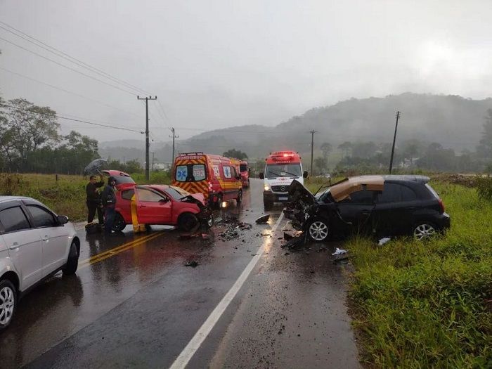 O Corpo de Bombeiros Militar de Orleans foi acionado hoje (22), às 14h30, para atender um acidente que envolveu dois veículos - um Ford Ka vermelho e um Nissan March preto - na SC-390, no bairro Pindotiba.