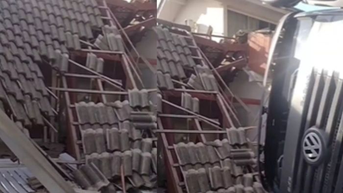 A garagem da residência foi danificada, o muro e o portão eletrônico foram quebrados, o telhado foi afetado e vidros e a estrutura da casa também foram comprometidos