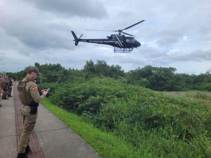 Viaturas da PM e Polícia Penal cercaram a Avenida da Saudade e o trecho da Beira-Mar Norte que circundam o mangue. Helicópteros também sobrevoam a região e cães farejadores foram solicitados. De acordo com a PMSC, embarcações do Corpo de Bombeiros foram acionadas para cercar o manguezal pelo mar e agilizar a captura. O intuito é encontrá-lo antes que anoiteça.