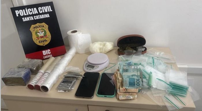 Durante a busca na residência do suspeito, os policiais apreenderam quantidade significativa de drogas, além de dinheiro em espécie e uma balança de precisão, itens comumente usados na narcotraficância. O cumprimento do mandado contou com o apoio do canil da Polícia Militar de Laguna.