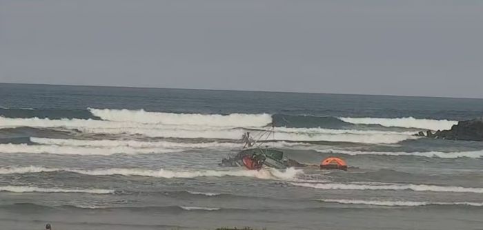 O barco naufragado ficou completamente destruído e está encalhado próximo ao molhe norte da praia.