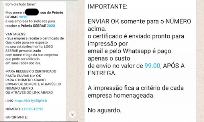 Eles enviam mensagem pelo WhatsApp cobrando pela participação de empresas em premiação