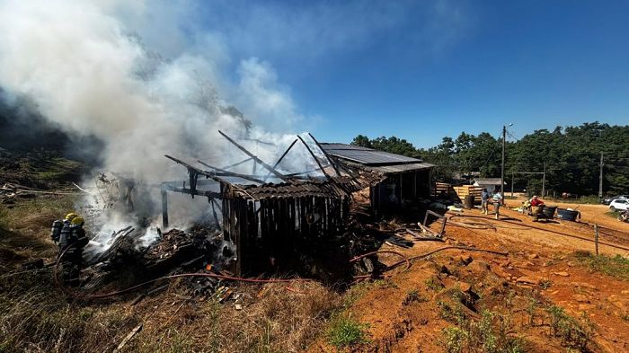Um incêndio destruiu uma estufa de secagem de fumo na manhã deste domingo, 16, na Estrada Geral Rio Laranjeiras, em Orleans. Quando os bombeiros chegaram, o galpão de madeira já estava completamente tomado pelo fogo, atingindo fumo armazenado, equipamentos agrícolas e até uma motocicleta.