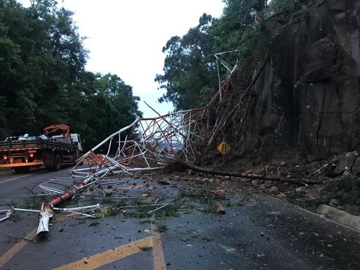 A torre de uma rádio local na BR-282, em Xaxim, no oeste catarinense, caiu na madrugada desta quinta-feira (14) com as fortes chuvas e rajadas de vento. Órgãos de segurança foram acionados por volta das 3h.