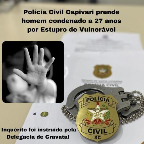 Na tarde desta quinta (05) a Polícia Civil de Capivari de Baixo, sob o comando do Delegado Felipe Samir Ferreira Andrade, deu cumprimento a um mandado de prisão por sentença condenatória pelo crime de estupro de vulnerável.