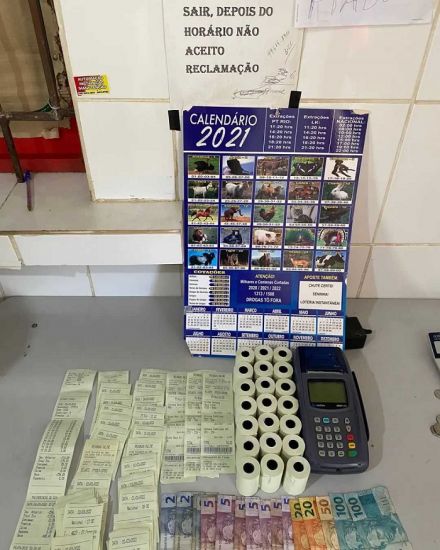 Em revista foram apreendidos uma máquina de apostas, 21 bobinas de papel para máquina, 59 bilhetes de apostas, R$ 346,50 um relatório com a movimentação do dia.