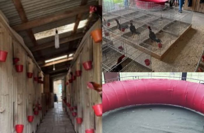 No local, foram encontrados galos mutilados, inclusive com ferimentos graves na cabeça, além de esporas, biqueiras e estruturas típicas para os combates. Também havia um criadouro de aves usado, segundo a investigação, para comercialização dos animais, e anotações com resultados de campeonatos.