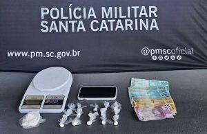 Durante o patrulhamento, os agentes identificaram o suspeito enquanto ele se deslocava para realizar a entrega de entorpecentes. Em busca pessoal, foram encontrados aproximadamente 35 gramas de cocaína, R$ 635 em dinheiro, um aparelho celular e uma balança de precisão.
