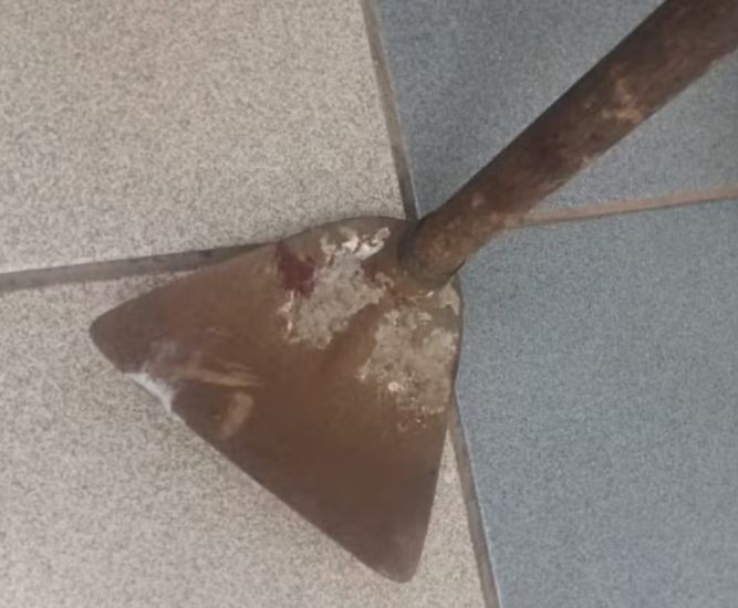 No boletim de ocorrência, o irmão informou que o suspeito estava bêbado, quebrando as coisas de casa, e acabou golpeando a mãe com a enxada, fazendo um corte na testa dela.