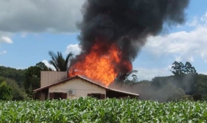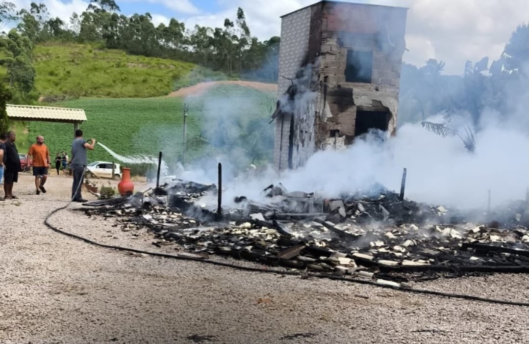 Um incêndio destruiu completamente uma residência na tarde desta quinta-feira (27), na Rodovia Municipal Domingos Gislon, bairro Auxiliadora, em Treze de Maio.