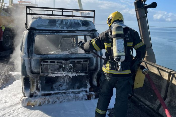 Veículo foi consumido pelas chamas na manhã desta segunda-feira (2); fogo chegou a danificar parte do revestimento de um dos estais da ponte