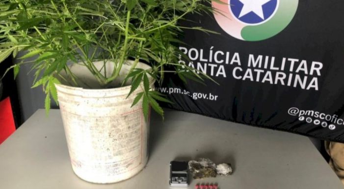 Ao chegar ao local, os policiais encontraram a residência revirada, com objetos quebrados. Durante a busca, foram localizados 77 gramas de maconha, 10 comprimidos de ecstasy, um pé de maconha e uma balança de precisão.