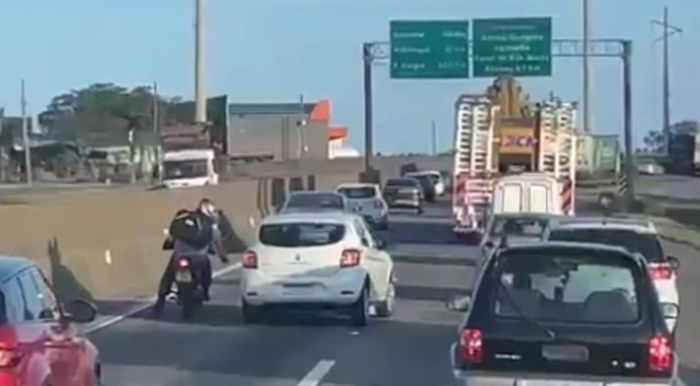 Segundo relatos, o motociclista tentou agredir o motorista do carro com um soco enquanto ambos seguiam pela via. A troca de ofensas durou alguns metros, até que o motoqueiro acabou colidindo contra o carro e caindo na pista.