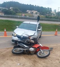 Um motociclista de 24 anos ficou ferido após um acidente na marginal da BR-101, no km 345, no bairro Costa da Lagoa, em Jaguaruna, na manhã desta terça-feira (18). Os Bombeiros Voluntários do município foram acionados por volta das 7h10 para atender a ocorrência, que envolveu uma Honda Bros, com placas de Imaruí, e um Renault Logan, de Laguna.