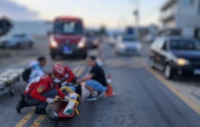 No local, a vítima, condutor de uma motocicleta com placas de Tubarão, estava caída na via e relatava dor intensa no membro inferior esquerdo.