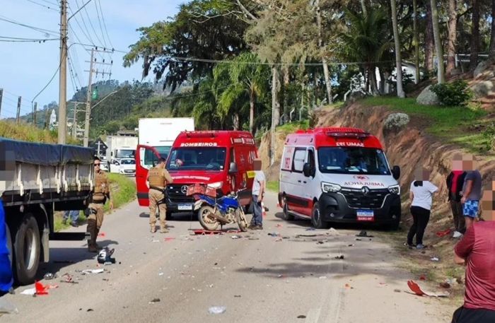 Morreu na manhã desta quarta-feira (8) um motociclista de 58 anos após um acidente de trânsito envolvendo um caminhão em Treze de Maio. A colisão ocorreu por volta das 15h30.