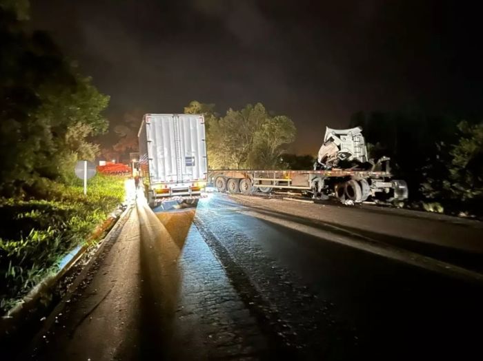 Uma pessoa ficou ferida e uma morreu após um grave acidente envolvendo dois caminhões e uma motocicleta na BR-470, em Agronômica, na manhã desta terça-feira (6), por volta das 5h. A colisão resultou na morte do motociclista, que ainda não foi identificado.