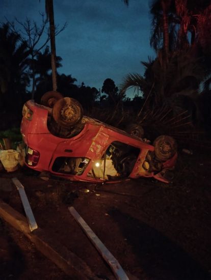 No local, a guarnição encontrou um veículo capotado no pátio de uma residência às margens da rodovia, dentro do carro havia o motorista, um homem de 53 anos. A vítima estava com as pernas presas ao volante, sendo necessário realizar o desencarceramento.