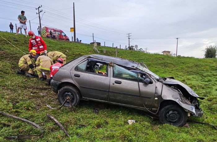 O condutor ficou preso no interior do carro, apresentando dores na coluna cervical e lombar, além de ferimentos nos braços. Os Bombeiros Voluntários de Jaguaruna foram acionados imediatamente e precisaram cortar a porta traseira do veículo para realizar a retirada com segurança.