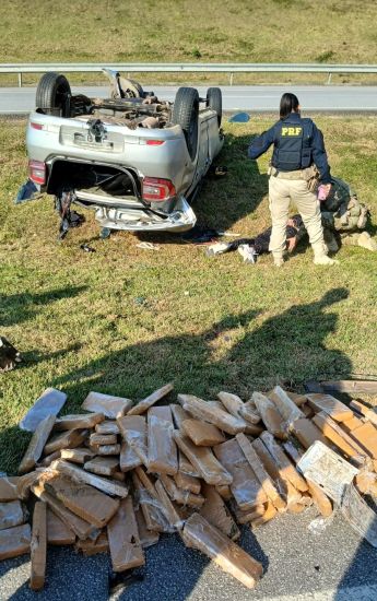 Uma perseguição que começou em Itapema terminou com capotamento e prisão na tarde desta terça-feira (8), no Contorno da BR-101, em São José. Policiais rodoviários federais apreenderam cerca de 97 quilos de maconha que estavam no porta-malas de um Renault Logan.