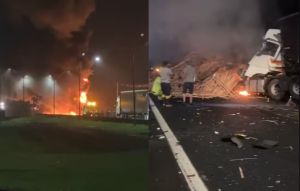 Imagens feitas no local mostram que a carga de madeira transportada por um dos caminhões caiu sobre a pista após o impacto.