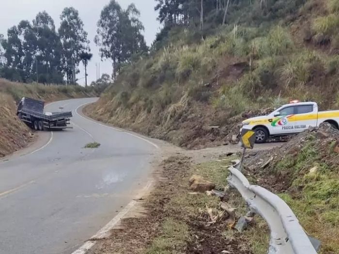 Na madrugada de sábado (04), por volta das 05h30min, um motorista de caminhão sofreu um acidente em São Joaquim após possivelmente cochilar ao volante. A Polícia Militar Rodoviária foi acionada para atender a ocorrência, onde constataram uma saída de pista seguida de colisão com um barranco.