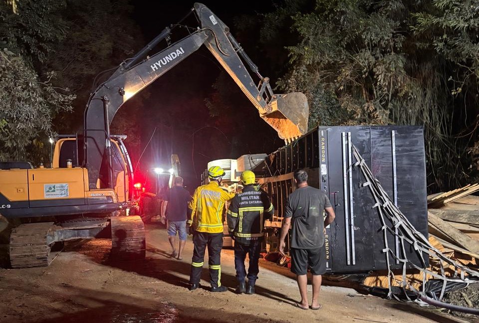 Para conseguir acessar o interior do veículo, foi necessário o apoio de maquinário pesado da Prefeitura de São Bonifácio. As equipes trabalharam na remoção parcial da carga de madeira e da estrutura da caçamba do caminhão, abrindo espaço para a operação de resgate.