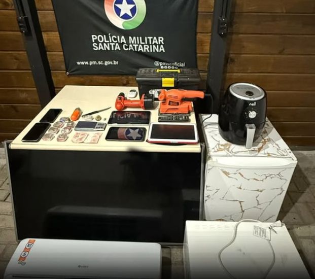 Com um dos suspeitos, de 31 anos, foram encontrados um frigobar, uma televisão, uma air fryer, um ar-condicionado, uma lixadeira, uma parafusadeira e três tablets. Já com outro homem, de 44 anos, estavam uma caixa de ferramentas e um micro-ondas.