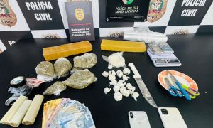Entre os itens apreendidos estão aproximadamente 2,9 kg de maconha, 226 g de crack, 74 g de cocaína, além de R$ 2.766 em dinheiro, quatro carregadores de pistola, cinco munições calibre .38, duas balanças de precisão e uma capa de colete balístico.