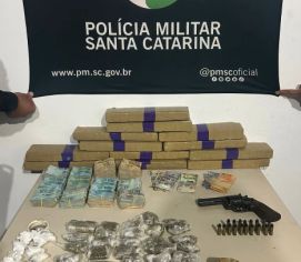 No total, foram apreendidos aproximadamente 10,5 quilos de maconha, cerca de 80 gramas de haxixe, um revólver calibre .38 com munições, duas balanças de precisão, celulares e cerca de R$ 120 mil em dinheiro.