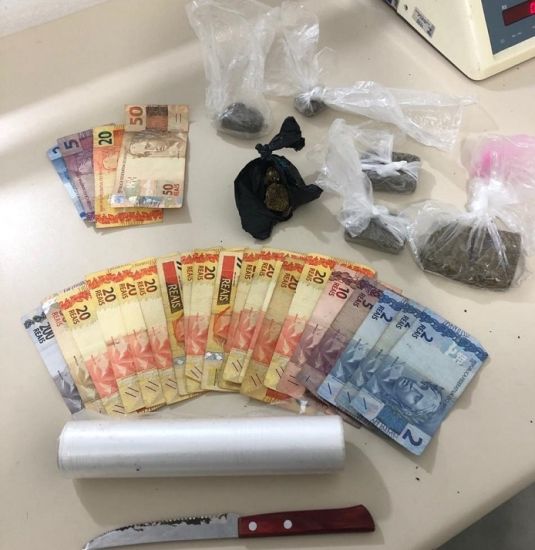 Na varanda da residência foi encontrado várias bitucas de cigarros de maconha e uma faca utilizada para cortar a droga.