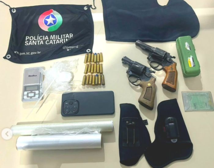 Ainda durante as buscas, os policiais encontraram uma mochila com dois revólveres calibre .38 — um deles com numeração suprimida — e 19 munições intactas. O suspeito alegou que a droga era para consumo próprio e que apenas uma das armas lhe pertencia.