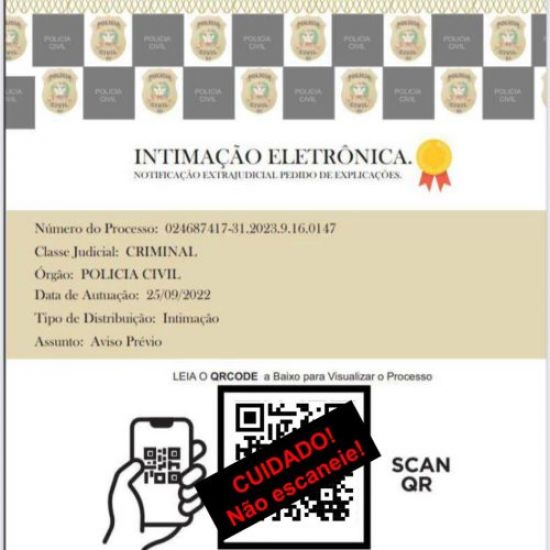 Golpistas estão enviando intimações com a alegação de serem da PCSC, induzindo as vítimas a acessarem um QR Code