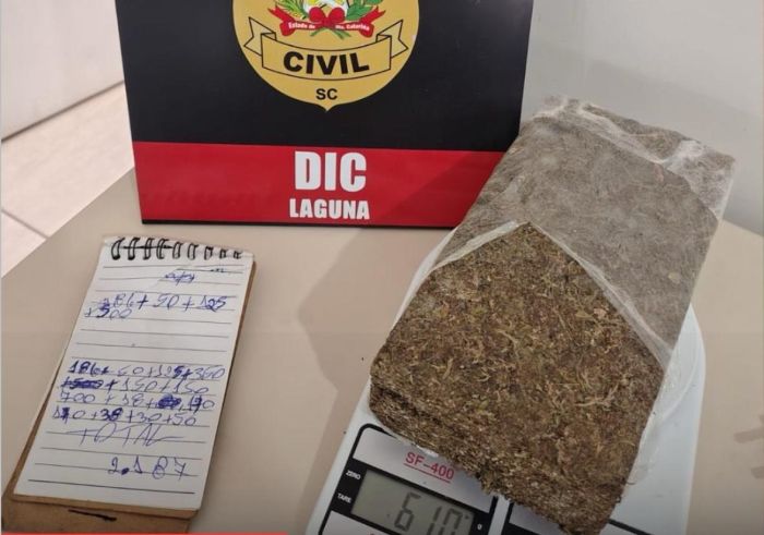 A investigação, conduzida pela DIC de Laguna há cerca de três meses, tem o objetivo de identificar e desarticular indivíduos envolvidos na comercialização de entorpecentes na região. Durante a ação desta tarde, os policiais apreenderam um “tijolo” de maconha, com aproximadamente 610 gramas, além de anotações que indicam a contabilidade do tráfico.