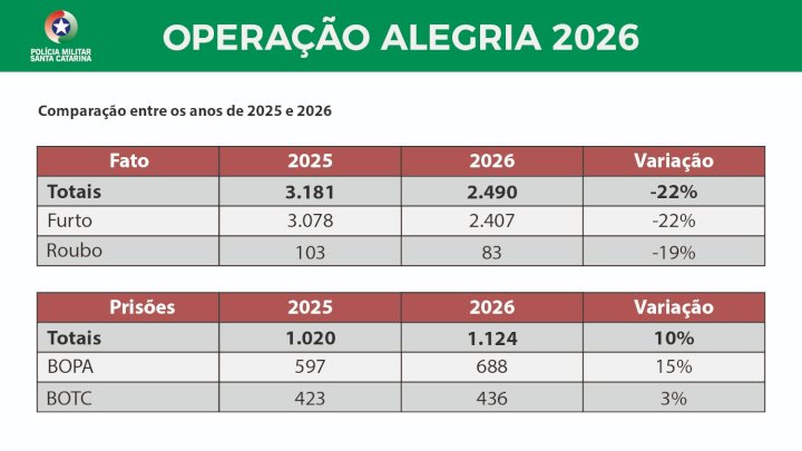 A Polícia Militar de Santa Catarina (PMSC) encerrou nesta quarta-feira (18) a Operação Alegria 2026, realizada durante o período de Carnaval em todo o estado. O balanço divulgado pela corporação indica redução nos principais crimes patrimoniais e reforço significativo nas ações de fiscalização e enfrentamento à criminalidade.