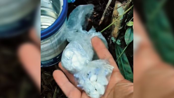 Equipes foram até a área apontada e contaram com o apoio do cão policial Gam, que durante a varredura identificou um recipiente escondido na mata. Dentro dele estavam 103 gramas de cocaína já fracionadas e embaladas, prontas para distribuição.