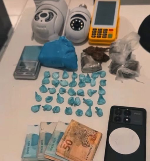 Durante as diligências, um indivíduo que estava em frente ao imóvel fugiu ao perceber a presença policial, enquanto outro foi abordado no interior do terreno. Na busca realizada no local, os policiais encontraram aproximadamente 120 gramas de cocaína, além de 36 buchas da mesma substância, um torrão de maconha pesando cerca de 96 gramas, R$ 3,5 mil em dinheiro e uma máquina de cartão.