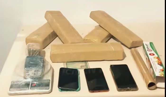 Nas buscas, os policiais localizaram cinco tabletes de maconha, que somaram aproximadamente 5 quilos, além de duas balanças de precisão e materiais utilizados para embalar a droga.