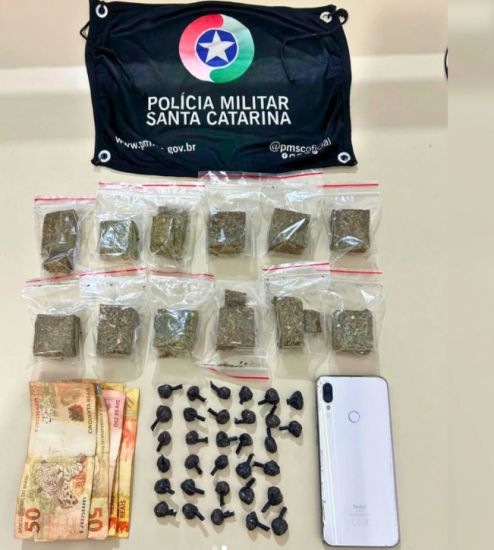 Ao chegar ao local, os policiais identificaram o suspeito e realizaram buscas na residência, onde foram encontradas 174,6 gramas de maconha, divididas em 7 porções, e 19,4 gramas de cocaína, distribuídas em 21 porções. No veículo do homem, foram localizadas mais drogas: 128,3 gramas de maconha (5 porções) e 10,7 gramas de cocaína (11 porções), além de R$ 150 em espécie.