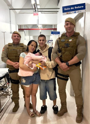 De acordo com as informações, os pais da criança pediram ajuda ao perceber que a recém-nascida estava engasgada e sem conseguir respirar. Eles abordaram uma viatura da Polícia Militar, que iniciou o atendimento imediatamente.