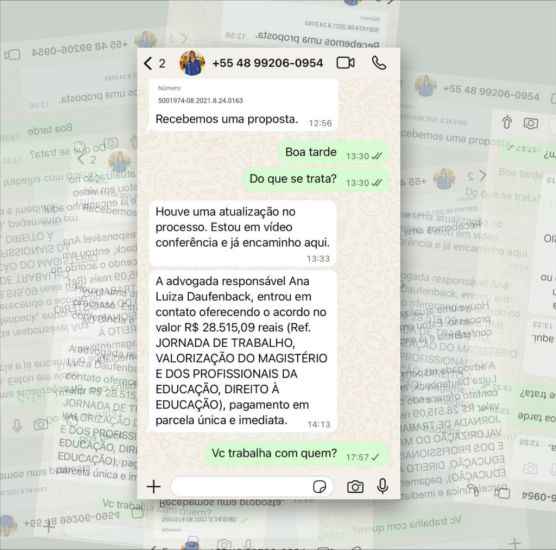Nos casos denunciados nesta terça-feira, o golpista envia mensagem afirmando que houve atualização em um processo e cita o nome da procuradora, alegando que estaria propondo um acordo. Em seguida, solicita um “adiantamento” em dinheiro para dar andamento à negociação. O contato falso inclui número de telefone e foto, que podem ter sido clonados ou adulterados.