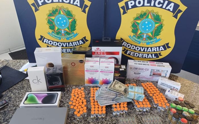 Durante a abordagem, foram encontrados 200 ampolas de Tirzepatida, medicamento usado para emagrecimento, 32 ampolas de esteroides anabolizantes, além de perfumes, smartphones, eletrônicos, R$ 7.401 em dinheiro e 2.607 dólares americanos.
