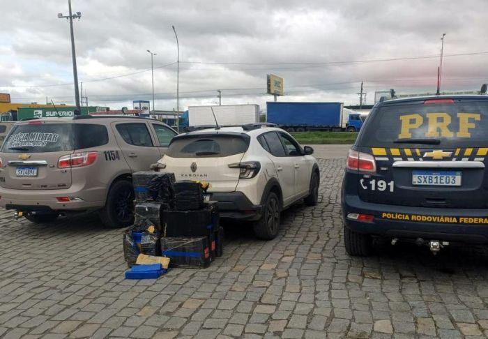 Durante a vistoria, os policiais perceberam o forte cheiro característico da droga vindo do Renault Kardian e encontraram o interior do carro tomado por tabletes de maconha embalados em fardos.