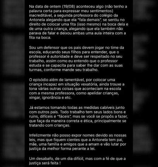 O pai de uma das meninas, Mario Junior, usou uma rede social para relatar o ocorrido, afirmando que as crianças, que são primas, passaram uma aula inteira com a fita na boca. "A professora se sentiu no direito de colocar uma fita (isso mesmo) na boca dela e de outra criança, alegando que elas não paravam de falar, e deixou ambas uma aula inteira com a fita na boca", escreveu ele.
