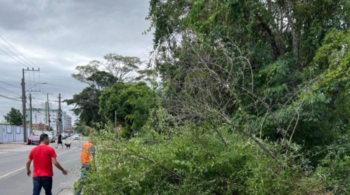 A força dos ventos já provocou a queda de árvores em três pontos da cidade: Avenida Getúlio Vargas, Avenida Lauro Müller e Rua Cuba