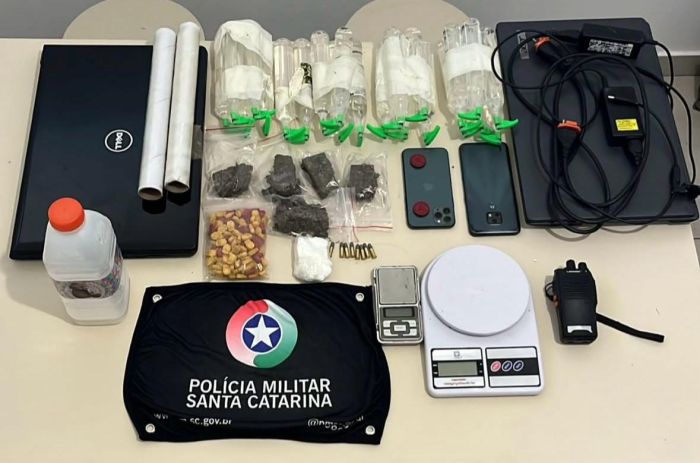 No interior da casa, dentro de uma caixa de som, os policiais localizaram 124 gramas de maconha, 56 gramas de cocaína, 123 comprimidos de ecstasy e 23 frascos de lança-perfume. Também foram apreendidas oito munições, dois aparelhos celulares, duas balanças de precisão e dois notebooks.