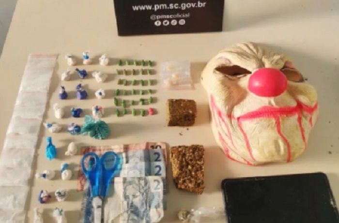 Cocaína, maconha, ecstasy, MD, além de uma máscara de palhaço, foram encontrados na casa do homem