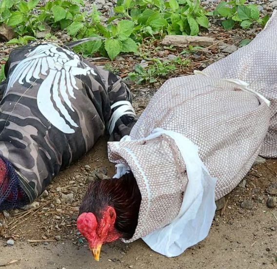 A polícia encontrou seis galos com as patas amarradas, três pintinhos, esporas de metal e plástico, remédios e seringas, todos itens comumente associados à prática ilegal de rinhas