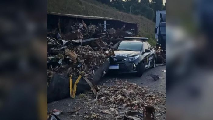 Um grave acidente ocorreu na BR-101 em Joinville, no Norte de Santa Catarina, na tarde de sexta-feira (28). Por volta das 16h20, um caminhão carregado de sucata tombou e atingiu uma viatura da Polícia Civil, além de uma moto e outra carreta, no km 37 da rodovia, no sentido Sul.